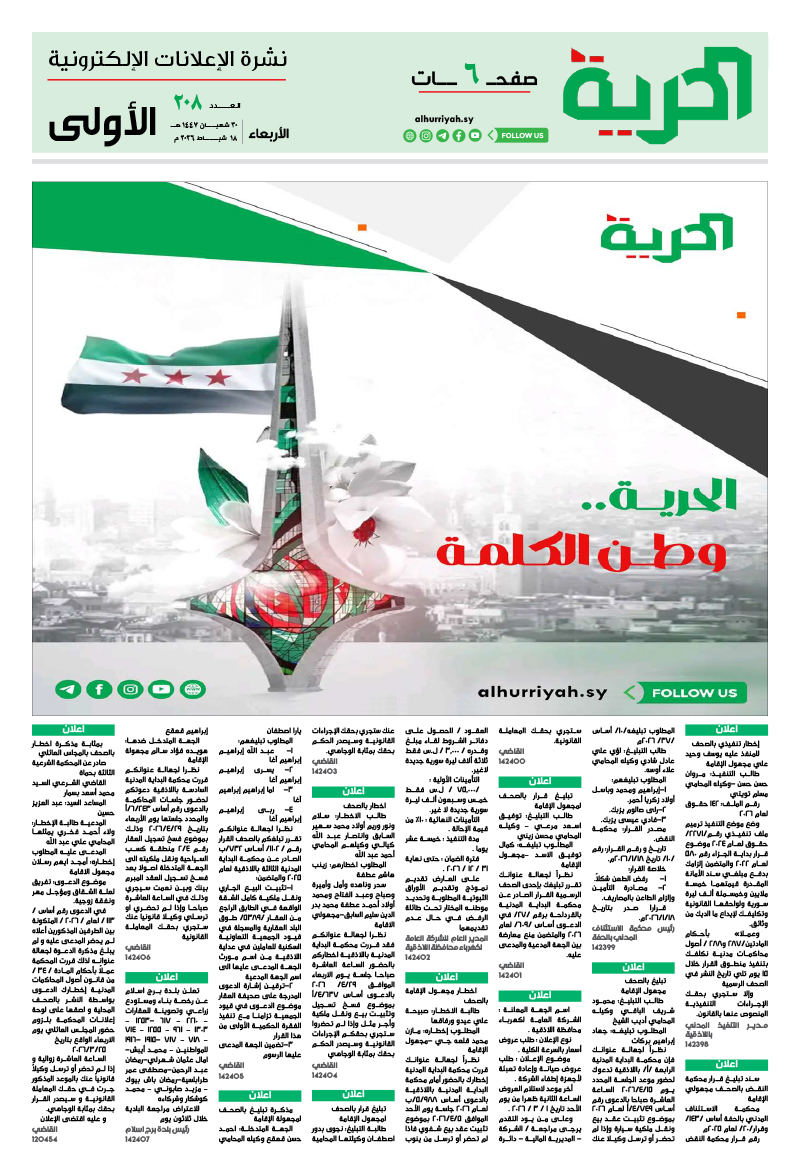 اعلانات «صحيفة-الحرية» العدد /208/ تاريخ 18-02-2026