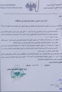 انطلاقاً من حرص وزارة الشؤون الاجتماعية والعمل في الحفاظ على حقوق العاملين لدى المنظمات غير الحكومية، طلبت الوزارة من مديرياتها في المحافظات التعميم على كافة المنظمات غير الحكومية العاملة ضمن محافظاتهم بوجوب الالتزام بأحكام قانون العمل رقم 17 لعام 2010 وقانون التأمينات الاجتماعية رقم 92 لعام 1959 والمبادرة إلى تسجيل العاملين السوريين ومن في حكمهم لدى المؤسسة العامة للتأمينات الاجتماعية .