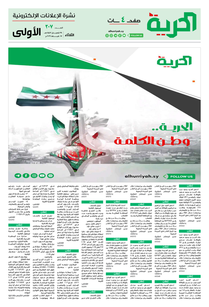 إعلانات اعلانات «صحيفة-الحرية» العدد /207/ تاريخ 17-02-2026 2026-02-17 مدة القراءة 0 دقيقة/دقائق مشاركة Loading... Taking too long? Reload document | Open in new tab تحميل الملف [0.97 MB] الوسوم:اعلاناتتاريخ 17-02-2026 Leave a Comment Leave a Comment اترك تعليقاً إلغاء الردلن يتم نشر عنوان بريدك الإلكتروني. الحقول الإلزامية مشار إليها بـ *التعليق * الاسم * البريد الإلكتروني * الموقع الإلكتروني احفظ اسمي، بريدي الإلكتروني، والموقع الإلكتروني في هذا المتصفح لاستخدامها المرة المقبلة في تعليقي.