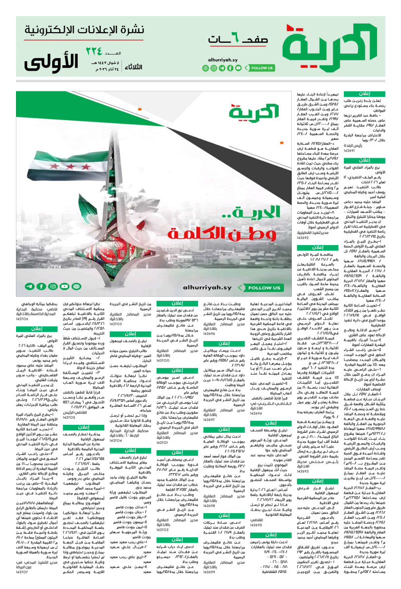 إعلانات اعلانات «صحيفة-الحرية» العدد /224/ تاريخ 24-03-2026 2026-03-24 مدة القراءة 0 دقيقة/دقائق مشاركة Loading... Taking too long? Reload document | Open in new tab تحميل الملف [1.23 MB] الوسوم:تاريخ 24-03-2026 Leave a Comment Leave a Comment اترك تعليقاً إلغاء الردلن يتم نشر عنوان بريدك الإلكتروني. الحقول الإلزامية مشار إليها بـ *التعليق * الاسم * البريد الإلكتروني * الموقع الإلكتروني احفظ اسمي، بريدي الإلكتروني، والموقع الإلكتروني في هذا المتصفح لاستخدامها المرة المقبلة في تعليقي.