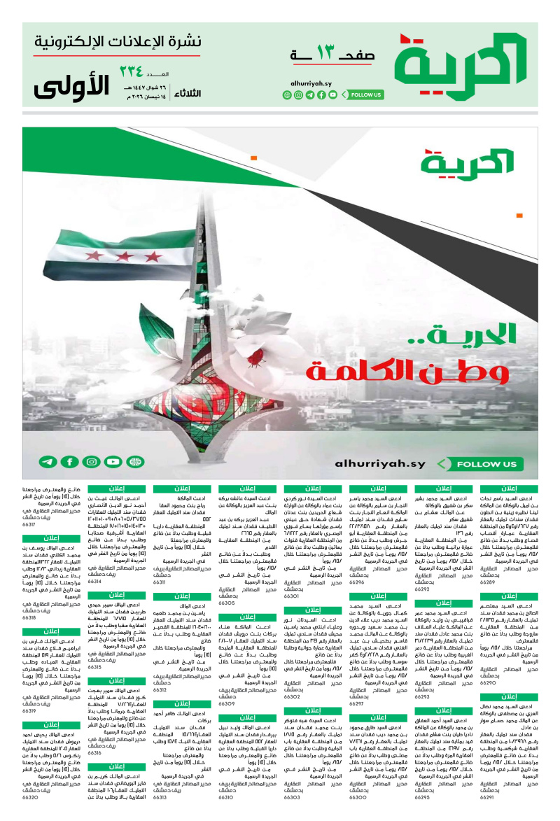 اعلانات «صحيفة-الحرية» العدد /234/ تاريخ 14-04-2026