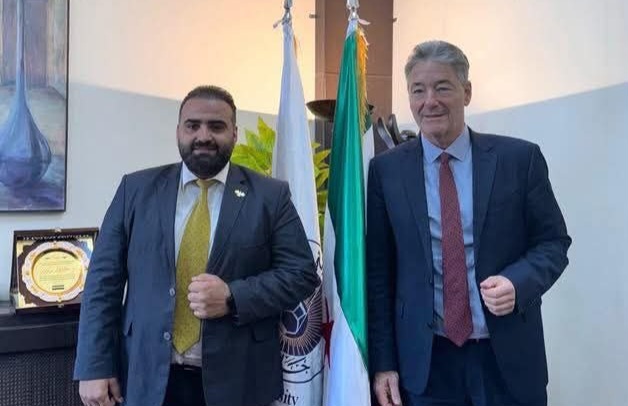 بحث عميد كلية الإعلام في جامعة دمشق الدكتور خالد زعرور مع السيد مايكل أونماخت رئيس بعثة الاتحاد الأوروبي لسوريا سبل تعزيز التعاون المشترك بين الكلية والاتحاد.