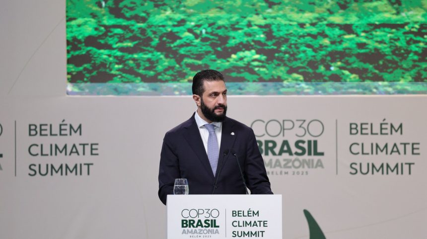 من قلب غابات الأمازون “رمز الحياة على كوكبنا”، كما وصفها، تحدث الرئيس أحمد الشرع خلال فعاليات الدورة الثلاثين لمؤتمر قمة المناخ (COP30)، ليحمل معاناة سوريا التي كانت “واحة تغنى بها الشعراء” إلى المنصة العالمية، داعياً إلى شراكة دولية تعيد تعريف العلاقة بين الإنسان والطربية.