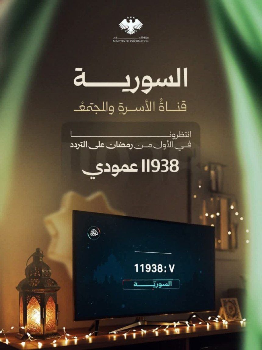 أعلنت وزارة الإعلام عن إطلاق البث التجريبي لقناة تلفزيونية جديدة تحمل اسم “السورية” مع بداية شهر رمضان المبارك، وذلك عبر قمر نايل سات على التردد 11938 V.