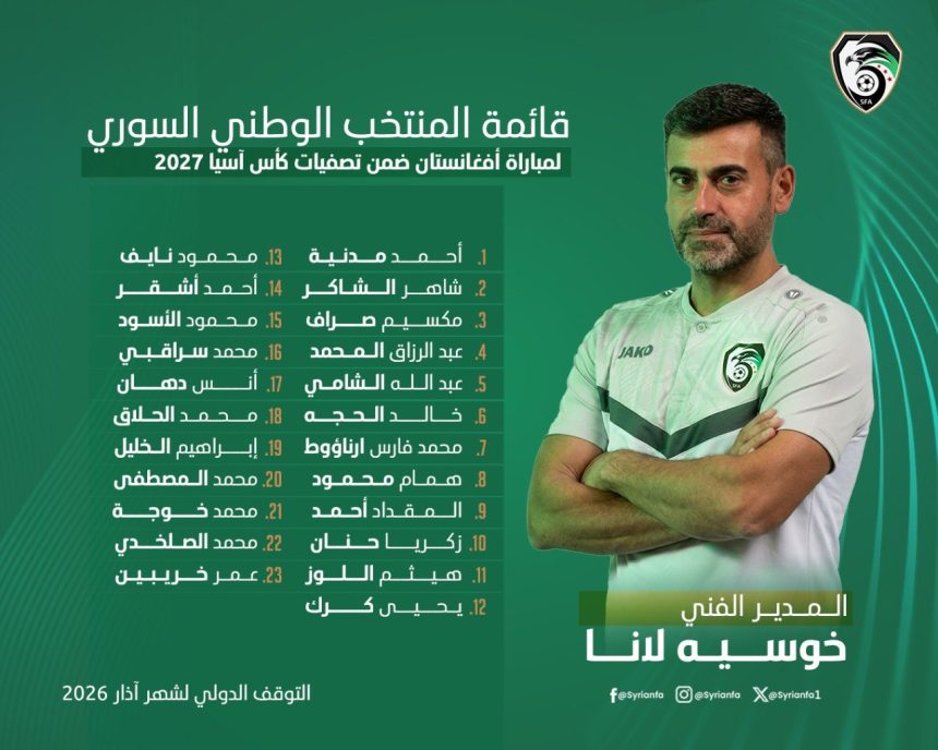 أعلن مدرب منتخبنا الوطني بكرة القدم الإسباني خوسيه لانا عن قائمة المنتخب للتوقف الدولي لشهر آذار 2026، والذي سنواجه فيه منتخب أفغانستان ضمن الجولة السادسة والأخيرة من تصفيات كأس آسيا 2027.