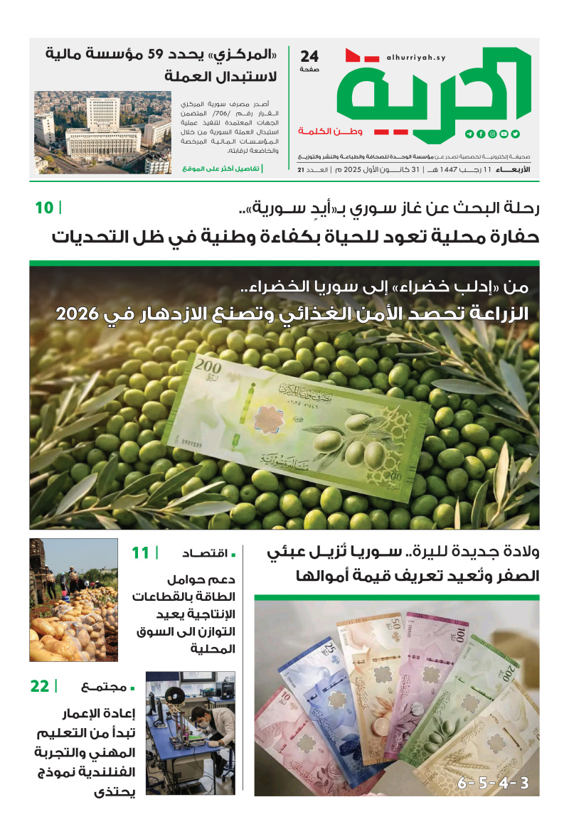 الصحيفة الالكترونية صحيفة الحرية العدد رقم /21/ تاريخ /31/ كانون الأول 2025-12-31 مدة القراءة 0 دقيقة/دقائق مشاركة Loading... Taking too long? Reload document | Open in new tab تحميل الملف [1.79 MB] الوسوم:العدد رقم /21/تاريخ /31/ كانون الأولصحيفة-الحرية Leave a Comment Leave a Comment اترك تعليقاً إلغاء الردلن يتم نشر عنوان بريدك الإلكتروني. الحقول الإلزامية مشار إليها بـ *التعليق * الاسم * البريد الإلكتروني * الموقع الإلكتروني احفظ اسمي، بريدي الإلكتروني، والموقع الإلكتروني في هذا المتصفح لاستخدامها المرة المقبلة في تعليقي.