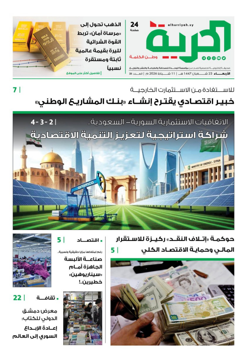 الصحيفة الالكترونية صحيفة الحرية العدد رقم /31/ تاريخ /11/ شباط 2026-02-11 مدة القراءة 0 دقيقة/دقائق مشاركة Loading... Taking too long? Reload document | Open in new tab تحميل الملف [1.98 MB] الوسوم:العدد رقم /31/تاريخ /11/ شباطصحيفة-الحرية Leave a Comment Leave a Comment اترك تعليقاً إلغاء الردلن يتم نشر عنوان بريدك الإلكتروني. الحقول الإلزامية مشار إليها بـ *التعليق * الاسم * البريد الإلكتروني * الموقع الإلكتروني احفظ اسمي، بريدي الإلكتروني، والموقع الإلكتروني في هذا المتصفح لاستخدامها المرة المقبلة في تعليقي.