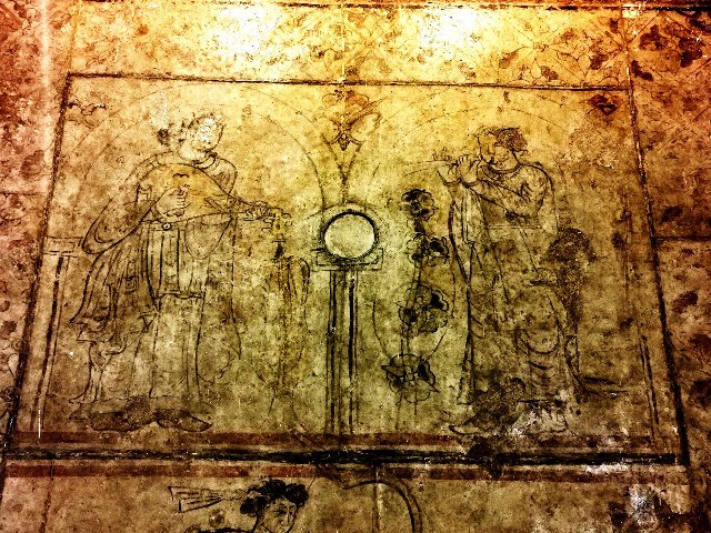 وقد اطلعتُ شخصياً على لوحة “فريسكو” ضخمة موجودة في المتحف الوطني بدمشق تعود إلى العصر الإسلامي الأموي (بين ٦٦١- ٧٥٠ ميلادي) اكتُشِفتْ كجزء من أرضية قصر الحير الغربي قرب مدينة تدمر/حمص، يظهر في اللوحة عازفان، أحدهما على العود (تبدو ملامح أنثى عازفة!) والآخر مع آلة هوائية تشبه الناي، واللافت أن شكلَ العود فيها يبدو بعنق (زند) قصير، وينتهي ب(بنجق/حامل المفاتيح) فيه أربعة مفاتيح فقط!