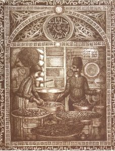 عوالمُ الباعة الدمشقيين ودكاكينهم أو “بسطاتهم” وأصواتهم وهم يروّجون لبضائعهم مع كل ما يجذب ويلفت ويرغّب ويفرح الزبائن.. شغلت فكر وأحلام الفنان خلدون شيشكلي إلى حدٍّ جعله يؤلف كتاباً كاملاً عنهم بعنوان “دكاكين وبياعين زمان” يتضمن عشرات من لوحاته المشغولة بتقنية الحفر على المعدن ثم تتم طباعة اللوحة المعدنية المدهونة باللون على قماشات أو أطباق كرتونية.. يمكن للمشاهد الاستغراق في تفاصيلها الشعبية والخطوط المكتوبة بشكل فطري على حوافها كأنما البائع البسيط هو من كتبها بنفسه وليس الفنانُ الحفّار.