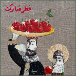 وبما إن للعيد بهجته الخاصة مهما عصفت رياح المحن جاءت لوحة الفنان بطرس المعري (بائع التفاح السكّري وابنه) مرسومة بطريقته المحببة الأقرب إلى “كاريكاتور كرتونيّ” بألوان الفرح ونكهة حلويات العيد والمعمول وروائح زهور الياسمين المنثورة فوق بسطة البائع الجوّال فيما ابتسامات رضىً تلوح تحت دخان سيجارته وعبارة” فطر مبارك” ترفرف فوقهما.