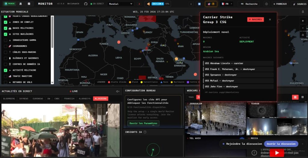 منصة شاملة: World Monitor هي لوحة معلومات (dashboard) مفتوحة المصدر تجمع في الوقت الفعلي تقريباً كل ما يحدث على الكوكب: أخبار من أكثر من 150 مصدر RSS، تتبع لأكثر من 220 قاعدة عسكرية، مراقبة للرحلات العسكرية الحية عبر ADS-B، تتبع للكابلات البحرية، اكتشاف حرائق الغابات عبر الأقمار الاصطناعية من وكالة ناسا، مؤشر عدم استقرار لكل دولة يُحتسب آنياً، وحتى “مؤشر بيتزا البنتاغون” الشهير .