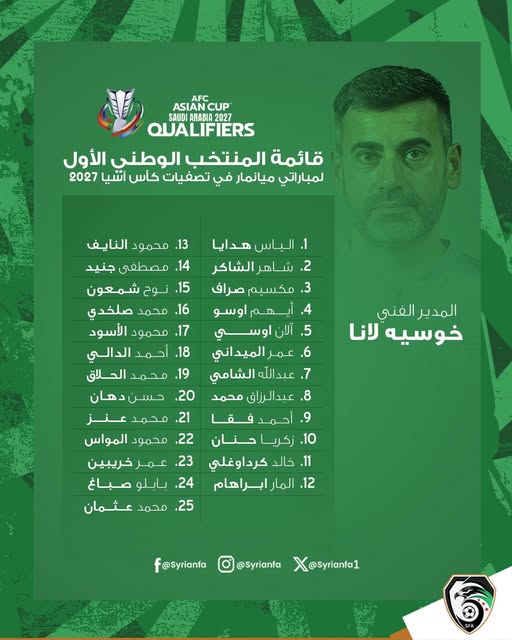 أعلن المدير الفني الإسباني خوسيه لانا قائمة منتخبنا الوطني للرجال بكرة القدم والتي تستعد لخوص مباراتي ميانمار في تصفيات كأس آسيا 2027.