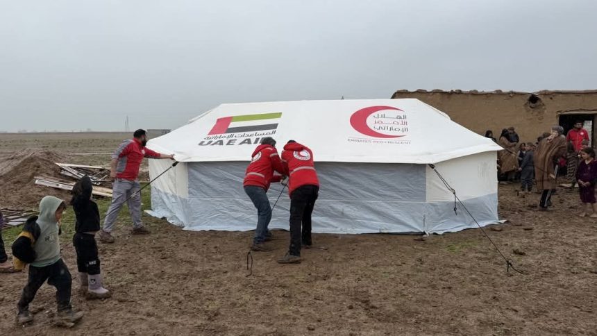 وزع الهلال الأحمر الإماراتي اليوم خيام إيواء طارئة على العائلات المتضررة من الفيضانات والأمطار الجارفة، في بلدة “تل حميس” والقرى المحيطة بها بريف الحسكة الشمالي الشرقي.