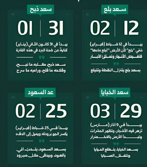 وتقسم خمسينية الشتاء إلى أربعة «سعودات»، مدة كل منها 12.5 يوماً، وهي: سعد الذابح، سعد بلع، سعد السعود، وسعد الخبايا، وقد حملت هذه التسميات حكايات شعبية تعكس معاناة الإنسان مع تقلبات الطقس.