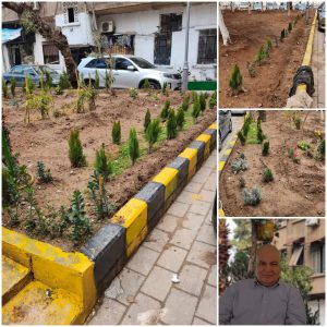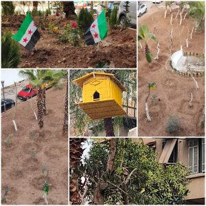 لقد أولى ” الحاج عبود ” هكذا يناديه كل من حوله في الحي الاهتمام والعناية بنظافة الحدائق الثلاث التي تبلغ مساحتها ما يقارب من 6 دونمات ويطل منزله عليها، وهذه الحدائق طالها النسيان والإهمال طيلة السنوات الماضية، فعمل على حرثها وتقليم الأشجار المتبقية فيها وغرسها بأشجار الزيتون حيث غرس 65 شجرة زيتون قدر قيمة الغرسة الواحدة ب 300 ألف ليرة بالإضافة إلى سقايتها عبر شراء صهاريج مياه بتكلفة 200 ألف ليرة للصهريج الواحد وكل ذلك على نفقته الخاصة ولا يبغي من راء ذلك إلا تحسين المساحات الخضراء بالحي، ولم يتوقف نشاط “الحاج عبود” عند هذا الحد بل بادر متطوعاً وعلى نفقته بحملة تجميل مدرستي شيماء السعدية ، والأمة العربية من خلال إزالة كافة رموز النظام السابق وإطلاق الجدران فيها.