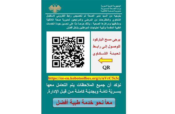 ونوه آغا بأن هذا النظام يعد كبديل عصري عن صناديق الشكاوى التقليدي يتيح للمراجعين تقديم ملاحظاتهم وشكاواهم بكل شفافية وسهولة من خلال مسح رمز الاستجابة السريع (QR) الموزع في جميع أماكن تقديم الخدمة الصحية؛ (مشافي عامة ومشافي خاصة ومراكز الرعاية الأولية)، وبأي زمان ومكان (بدون صناديق محددة الأماكن ومحدودة العدد).